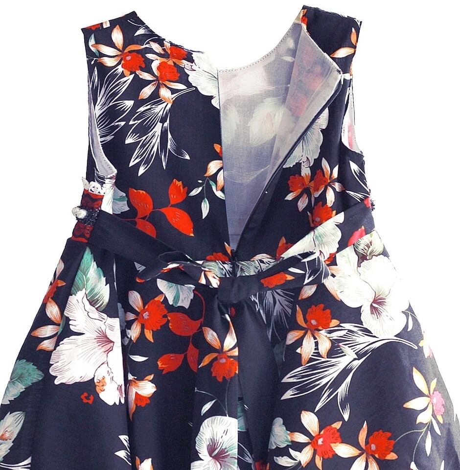 ★送料無料★キャップ付き 花柄プリント ノースリーブ ワンピース ダークブルー レースベルト パーティードレス子供服 キッズ ベビー