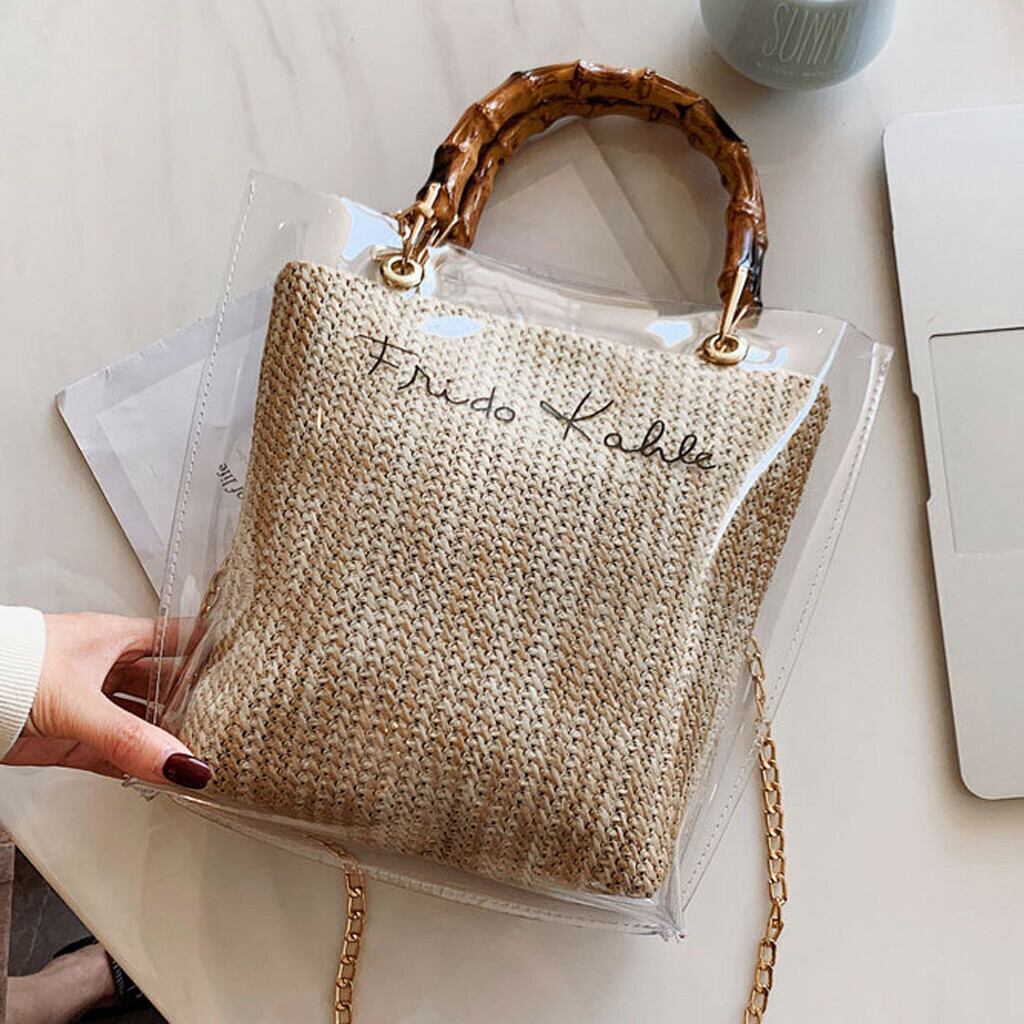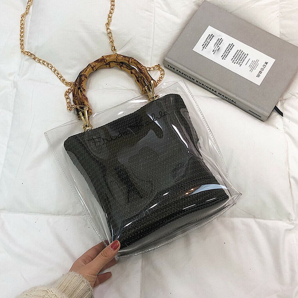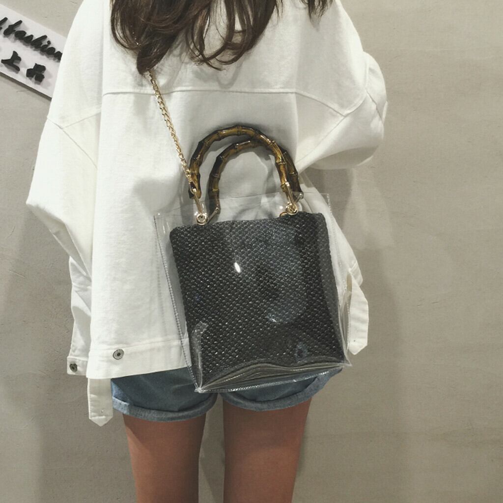★送料無料★ クリアバッグ 透明バッグ おしゃれ ハンドバッグ ショルダーバッグ カゴバッグ 籠 バンブー ウッドハンドル