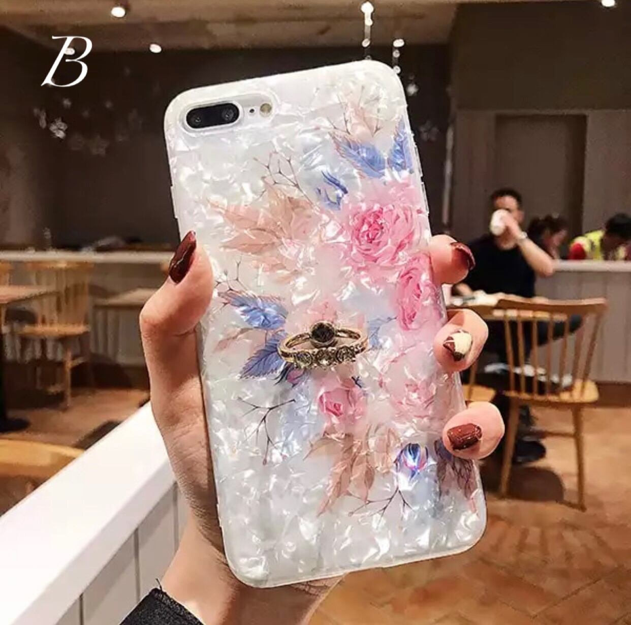 ★送料無料★A フラワー 花柄 iphoneケース スマホケース スリム シンプル 紫 青 ピンク パープル ブルー スマホリング フィンガーリング シェル 貝