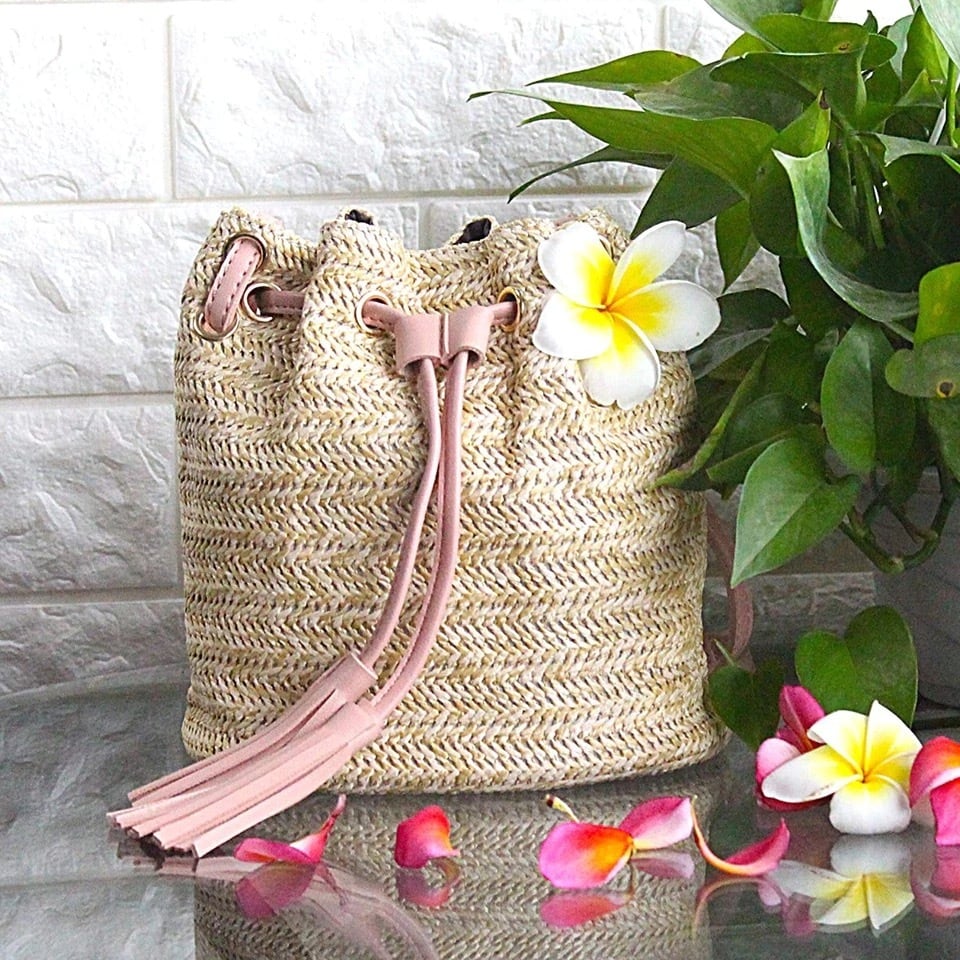 ★送料無料★ ピンク カゴバッグ 籠 かご バッグ レディース 夏 女性用 マリン ビーチ 海 プール わら素材 ショルダーバッグ タッセル