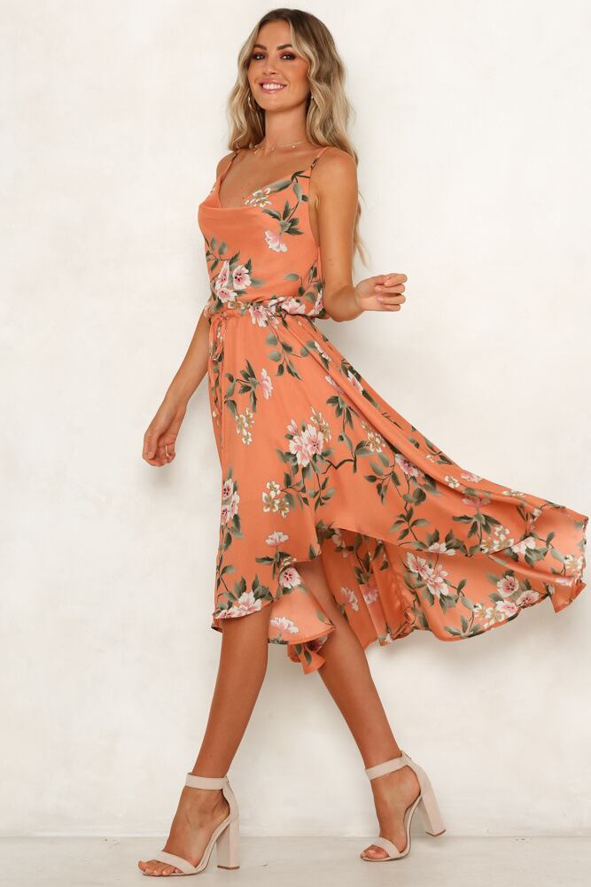 ★送料無料★ オレンジ 橙 花柄 フラワー ワンピース ノースリーブ レディース 女性 膝丈 夏 夏服 ビーチ 海 プール ボヘミアン