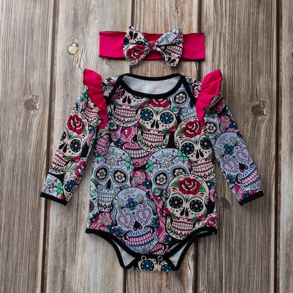 ★送料無料★ ハロウィン 3色 パープル 紫 スカル ロンパース ヘアバンド セット 赤ちゃん 子供 キッズ 女の子 ドクロ 骸骨