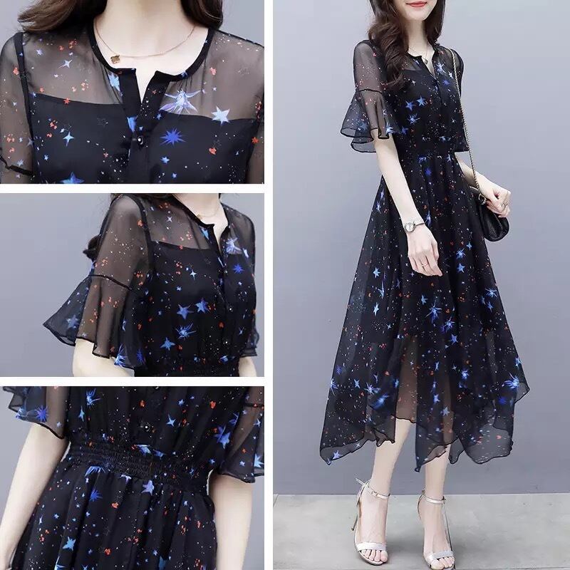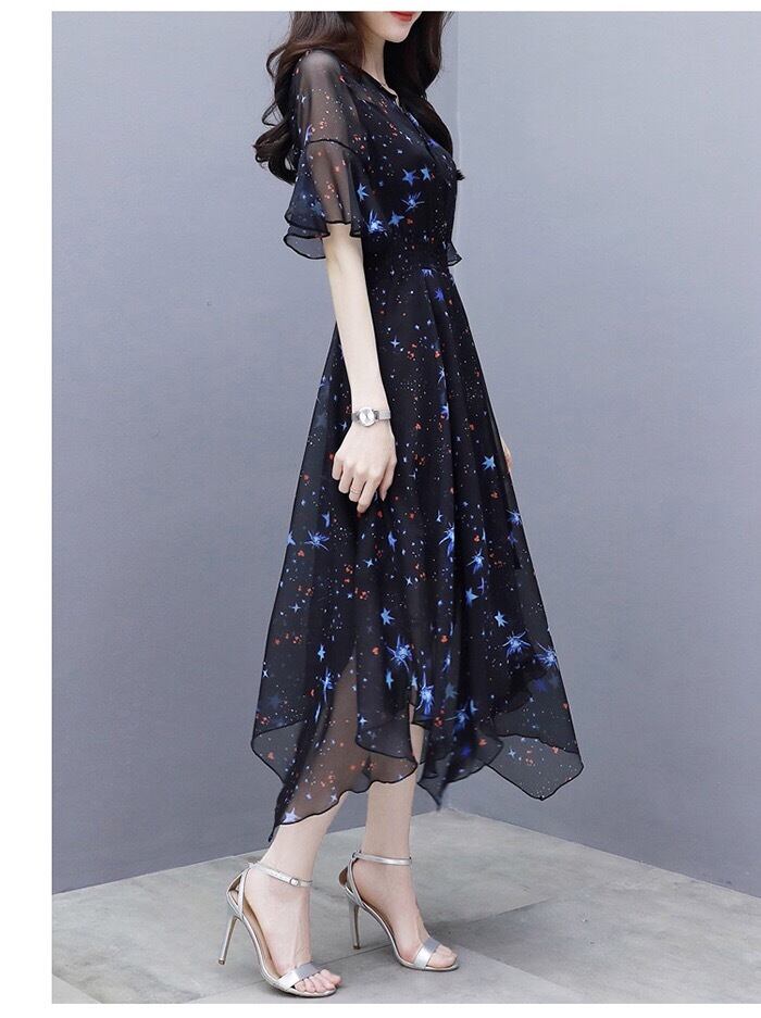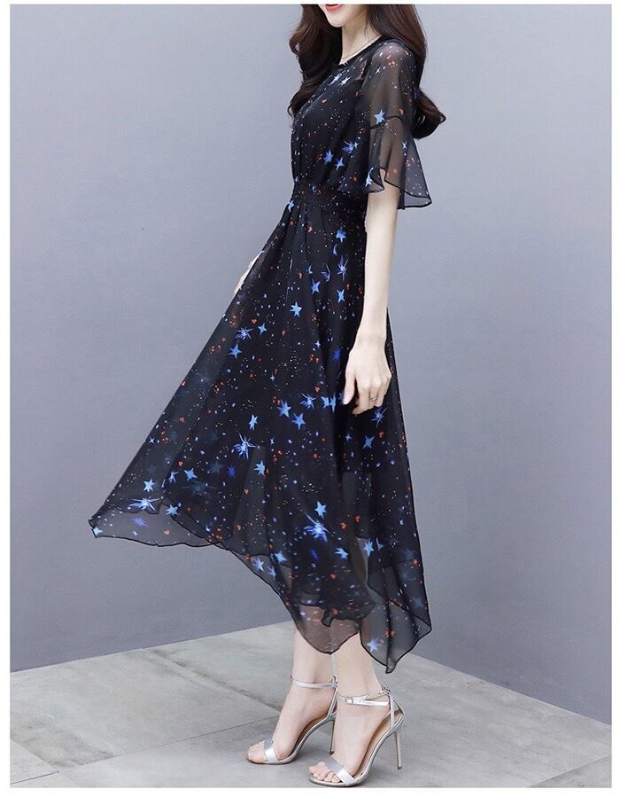 ★送料無料★ レディース ワンピース キラキラ 宇宙 星 半袖 膝下 ミドル 女性 大きいサイズ S M L XL 2XL 3XL