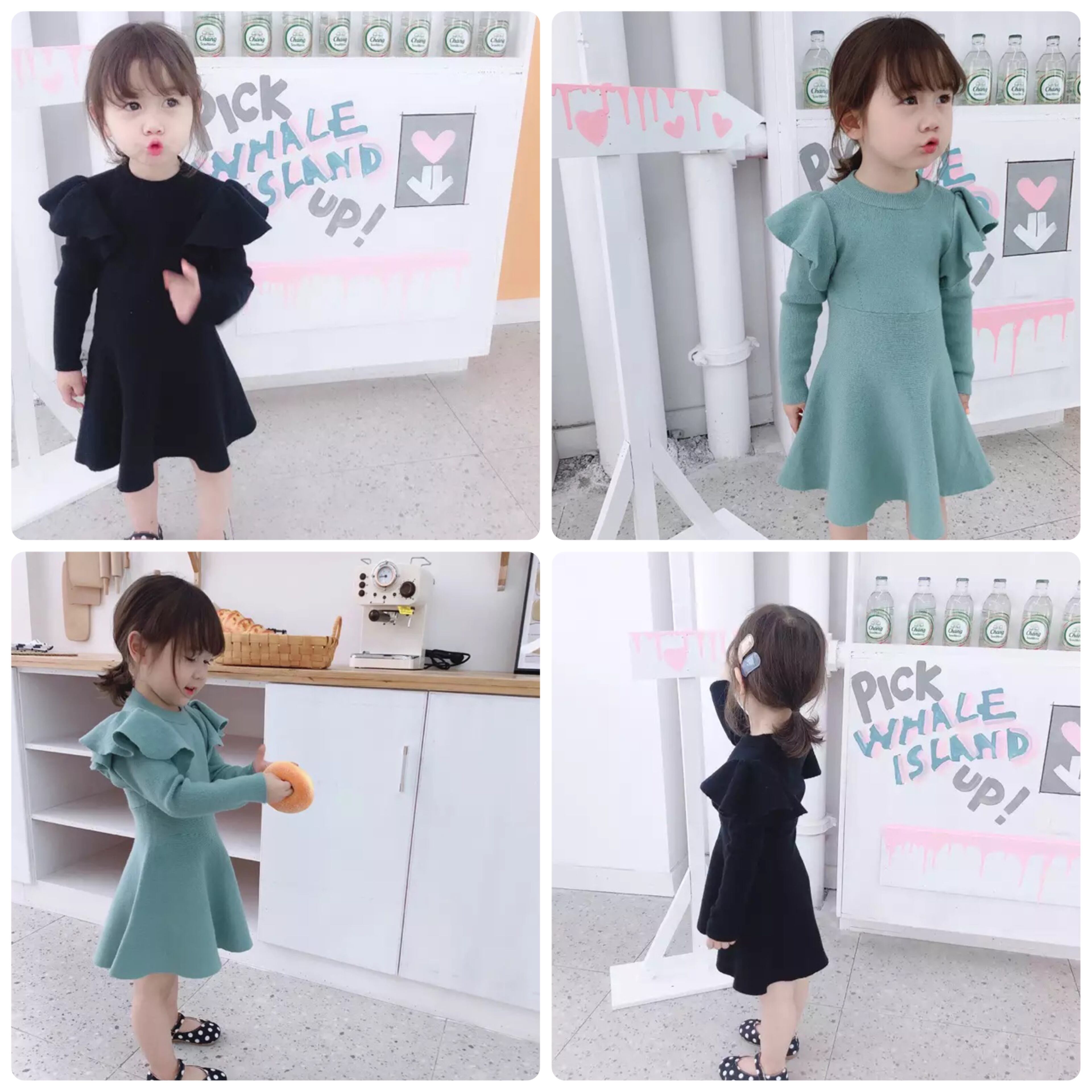 ★送料無料★ 2色 ブラック 黒 女の子 ワンピース ニット フリル 長袖 秋冬 子供 キッズ ベビー 1歳 2歳 3歳 4歳 5歳 6歳 7歳 8歳