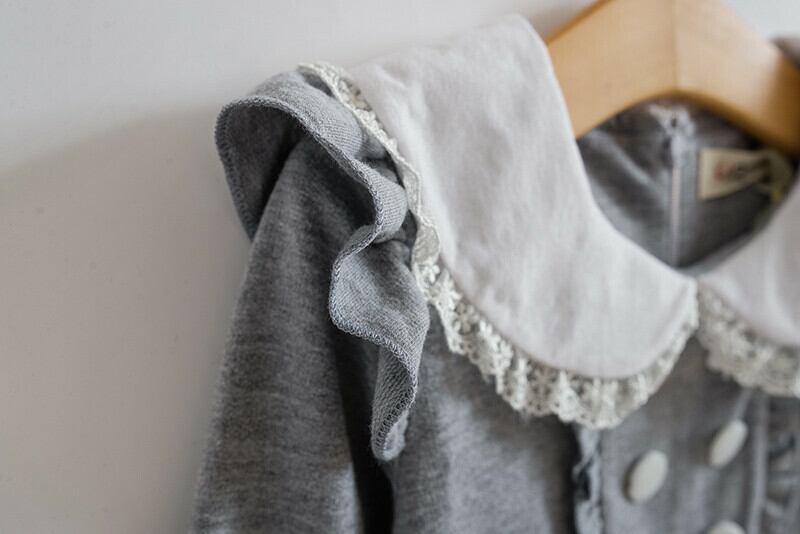 ★送料無料★ 2色 グレー 灰色 女の子 ワンピース きれいめ ボタン フリル 長袖 秋冬 子供 キッズ ベビー 3歳 4歳 5歳 6歳 7歳 8歳 9歳 10歳 11歳 12歳 13歳 14歳