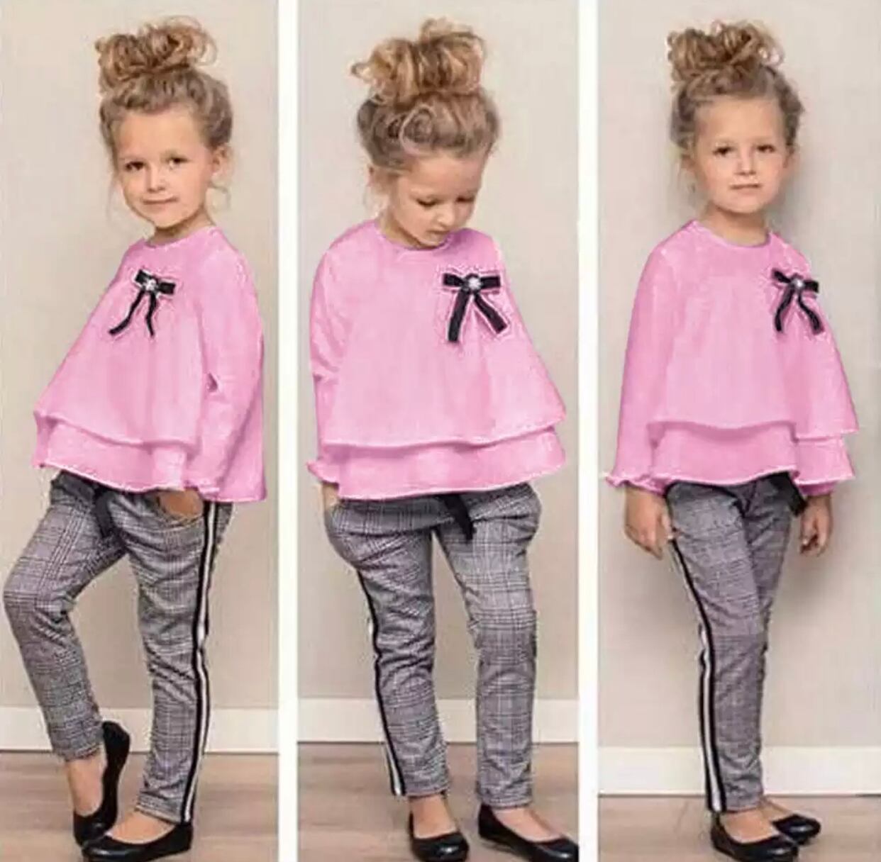 ★送料無料★ 5色 ピンク 女の子 チェックパンツ リボン ブラウス セット 長袖 秋冬 子供 キッズ ベビー 1歳 2歳 3歳 4歳 5歳 6歳