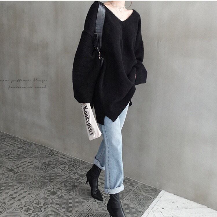 ★送料無料★ 3色 レディース フリーサイズ Vネック ニット セーター シンプル 韓国 ベージュ ピアス ブラック 黒 ミニマリスト オーバーサイズ