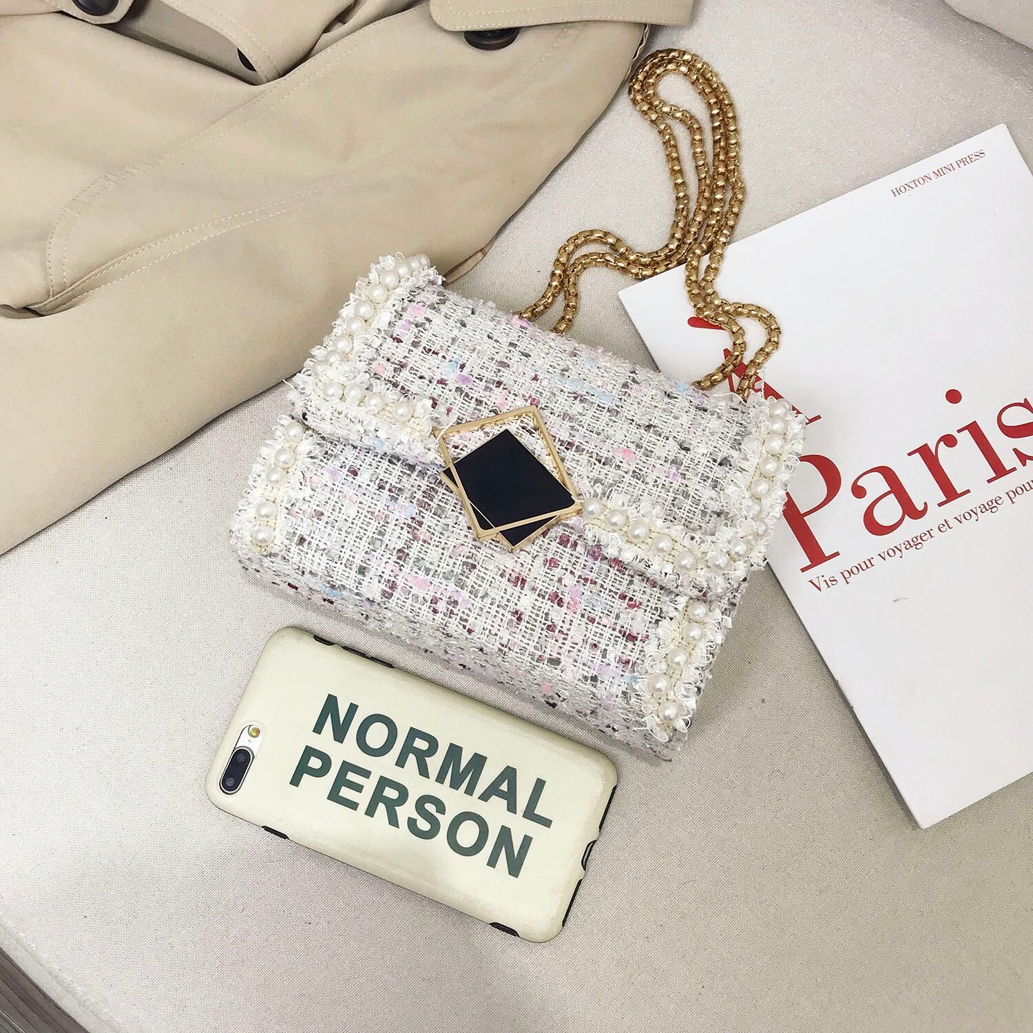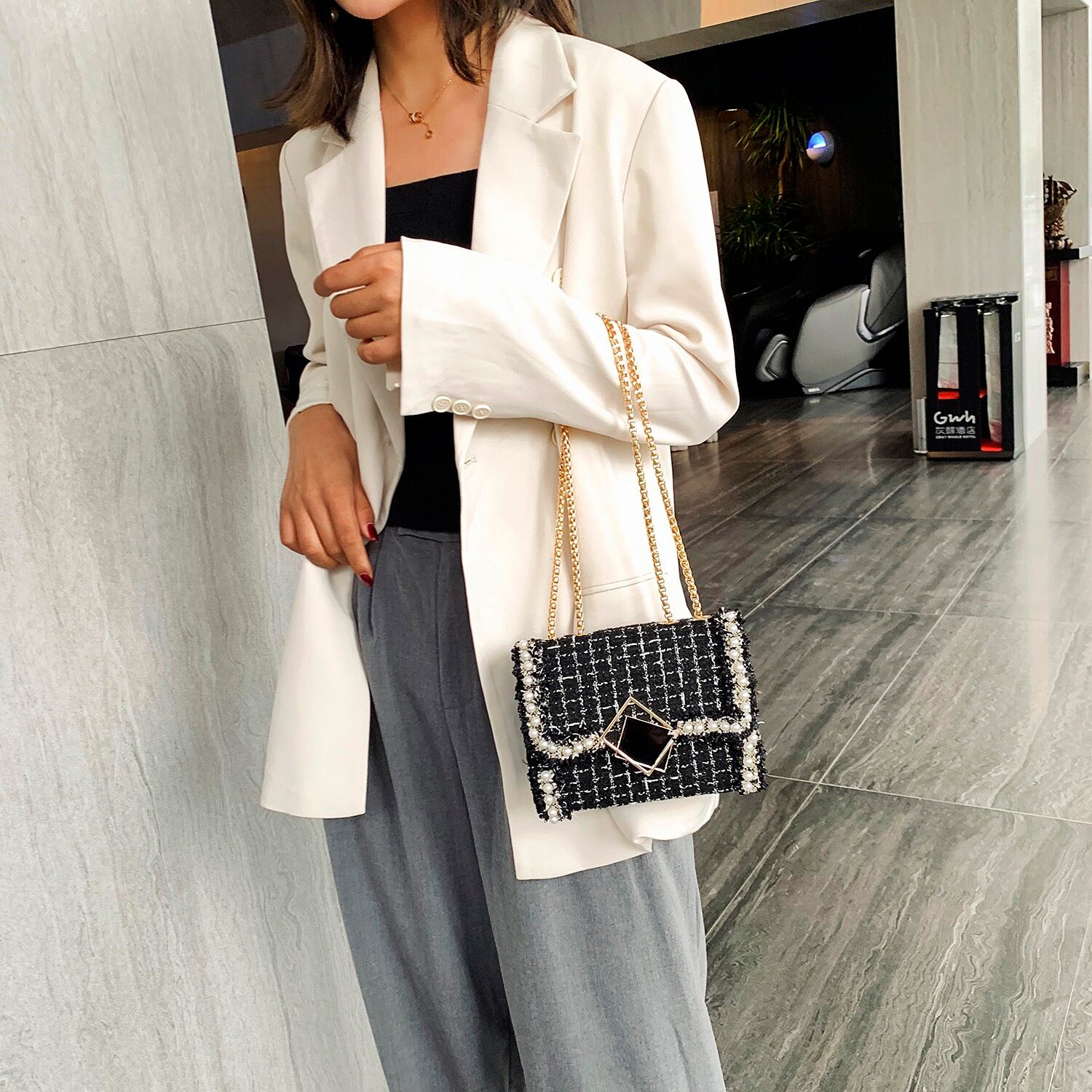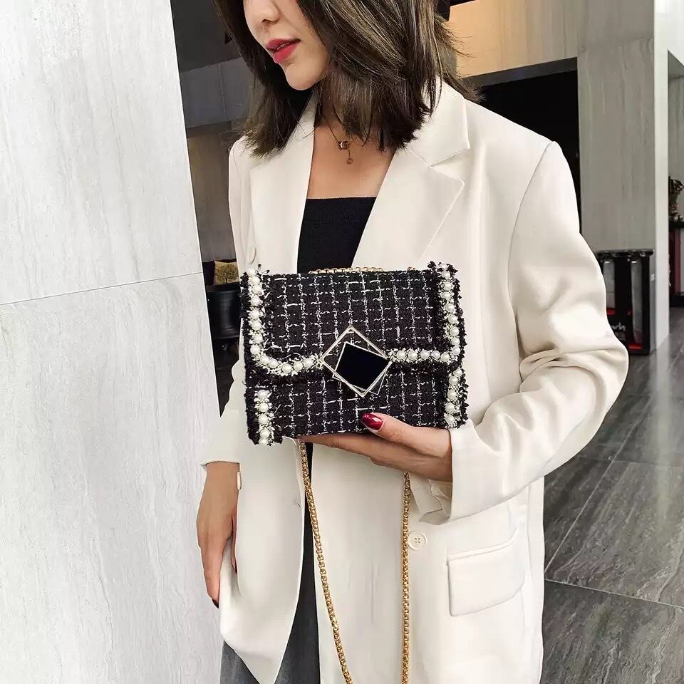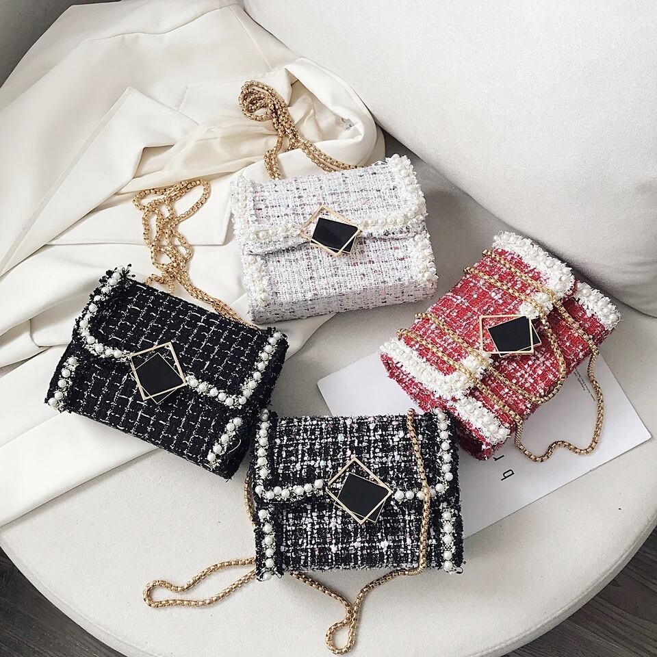★送料無料★ 4色 レディース 女性 バッグ ツイード 秋冬 パール 真珠風 チェック 格子 ショルダーバッグ ハンドバッグ チェーン ブラック グレー ホワイト レッド 黒 灰 白 赤