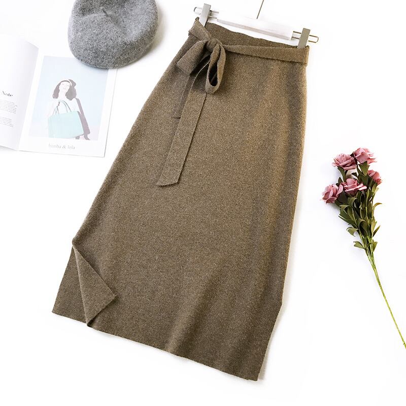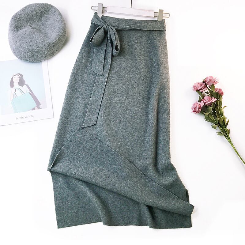 ★送料無料★ 3色 レディース ニットスカート リボン ハイウエスト Aライン 秋 冬 グレー ブラック ブラウン 茶 黒 灰