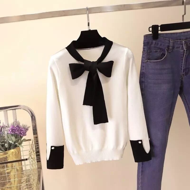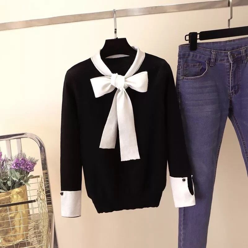 ★送料無料★ 3色 ブラック 黒 レディース ニット セーター リボン カフス ブラウス S M L