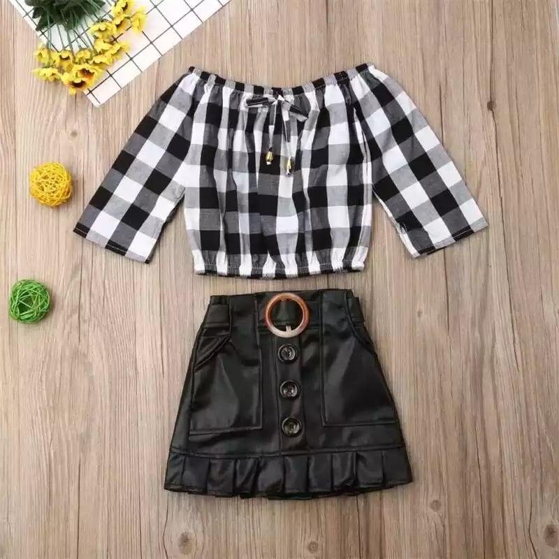 ★送料無料★ 女の子 レザー調 スカート チェック ブラウス 長袖 セット セットアップ子供 キッズ ベビー 秋 冬 2歳 3歳 4歳 5歳 6歳 7歳
