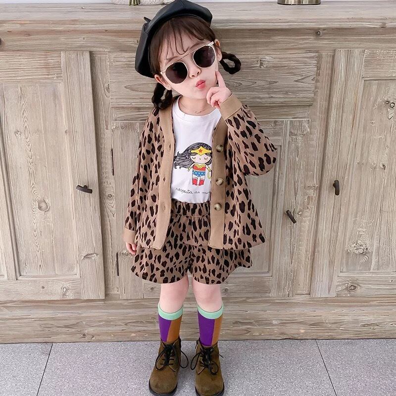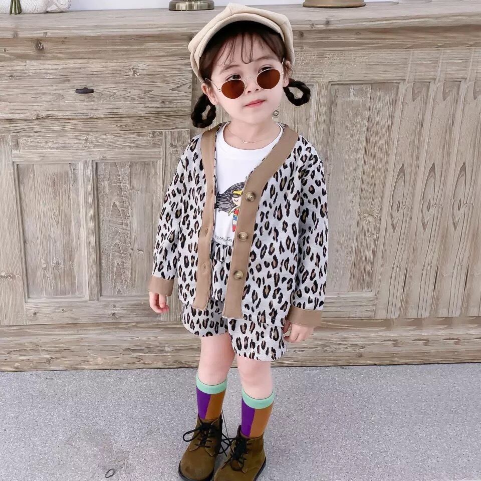 ★送料無料★ 女の子 2色 レオパード 豹柄 カーディガン ニット ショートパンツ セット セットアップ 子供 キッズ ベビー 秋 冬 2歳 3歳 4歳 5歳 6歳