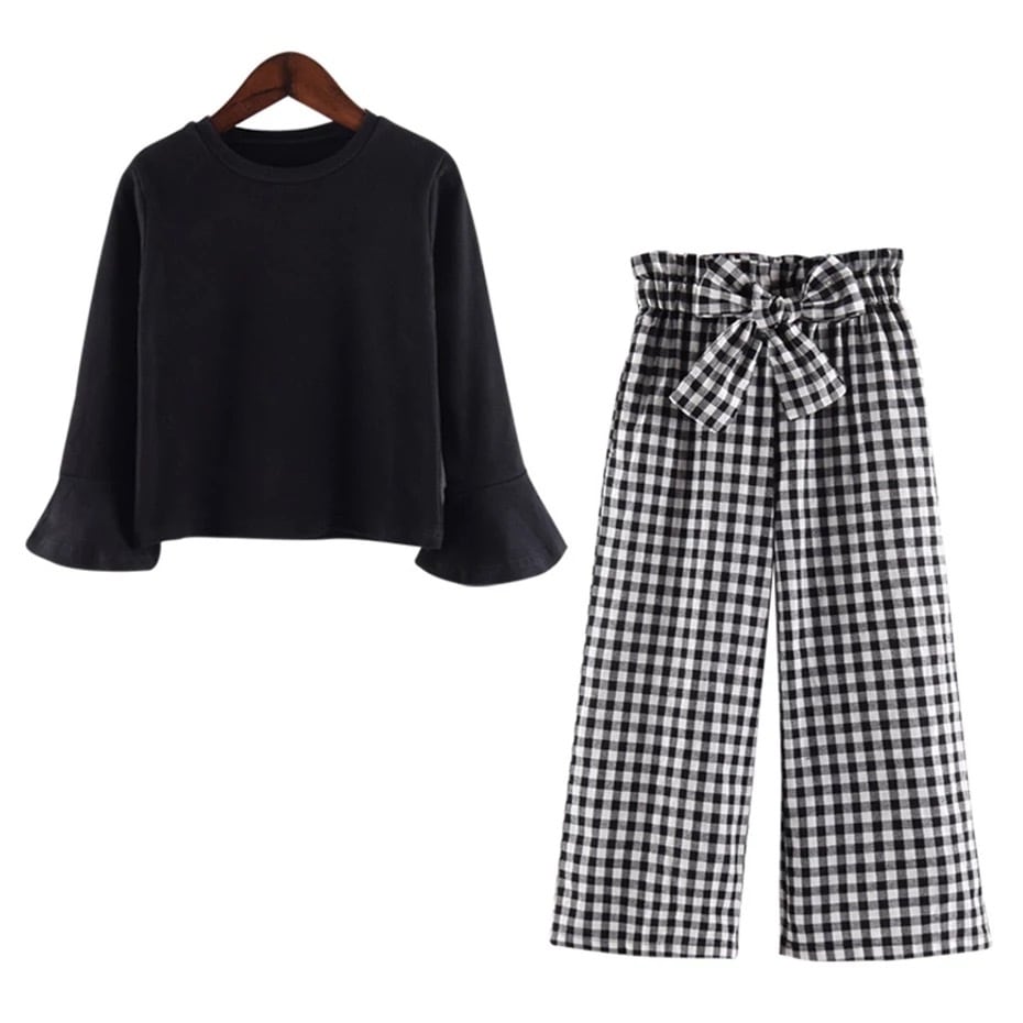 商品:ジュニア ブラックブラウス、チェックパンツセット