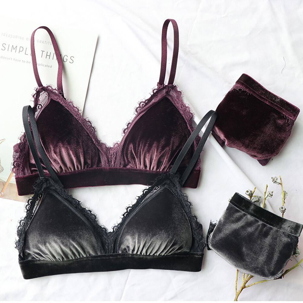 ★送料無料★ 5色 ブルー 青 ベルベット ベロア レディース 花柄 レース 柄 模様 ランジェリー パンツ ブラジャー セット ショーツ 女性用