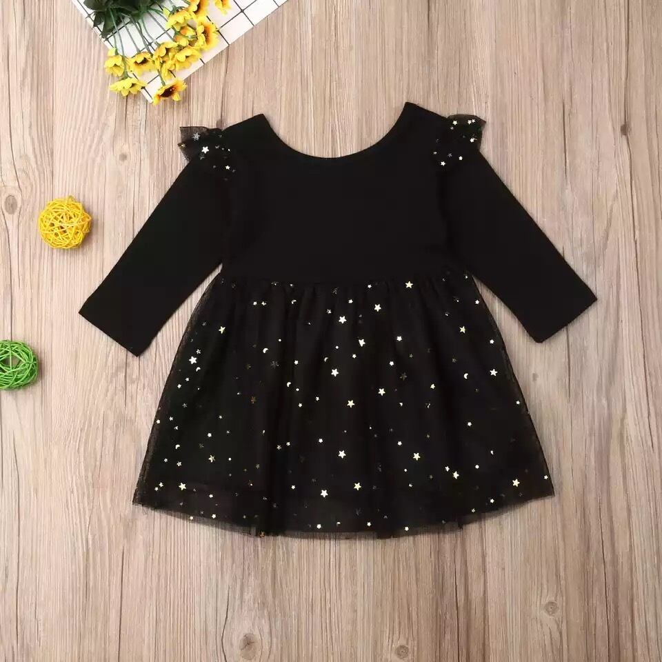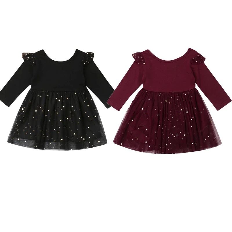 ★送料無料★ 女の子 2色 スター 星 キラキラ ワインレッド チュール ワンピース 長袖 スカート コットン キッズ ベビー 子供 服 1歳 2歳 3歳 4歳 5歳 秋 冬