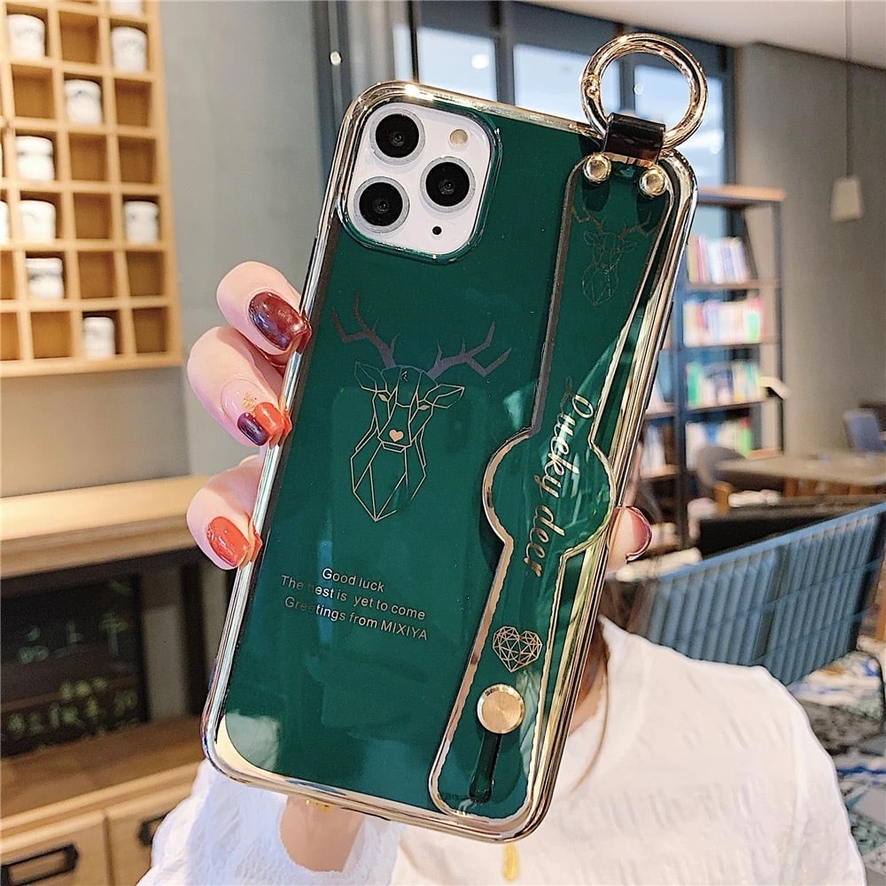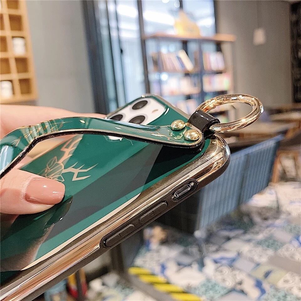 ★送料無料★ 3色 グリーン 緑 iPhone11対応 光沢 鹿 トナカイ シカ ハンドストラップ付 ストラップ フィンガー iPhoneケース スマホケース おしゃれ 最新 シンプル