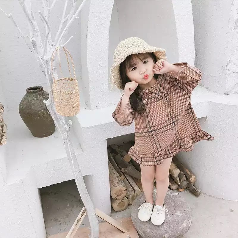 ★送料無料★ 2色 レッド系 女の子 チェック 襟付き ワンピース フリル ドレス キッズ 子供 ベビー 長袖 春 夏