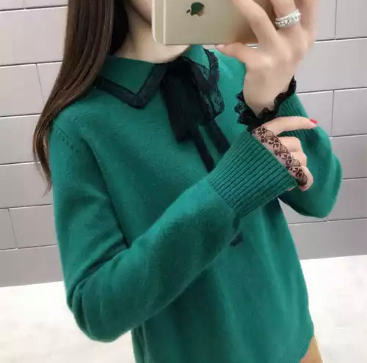 ★送料無料★ レディース 7色 レッド 赤 襟付き リボン レース ニット セーター 秋 冬 オフィスカジュアル