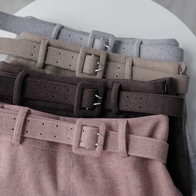 ★送料無料★ レディース 4色 ピンク ウール スカート ペンシル スリット ベルト 秋 冬 ハイウエスト ミディアム丈