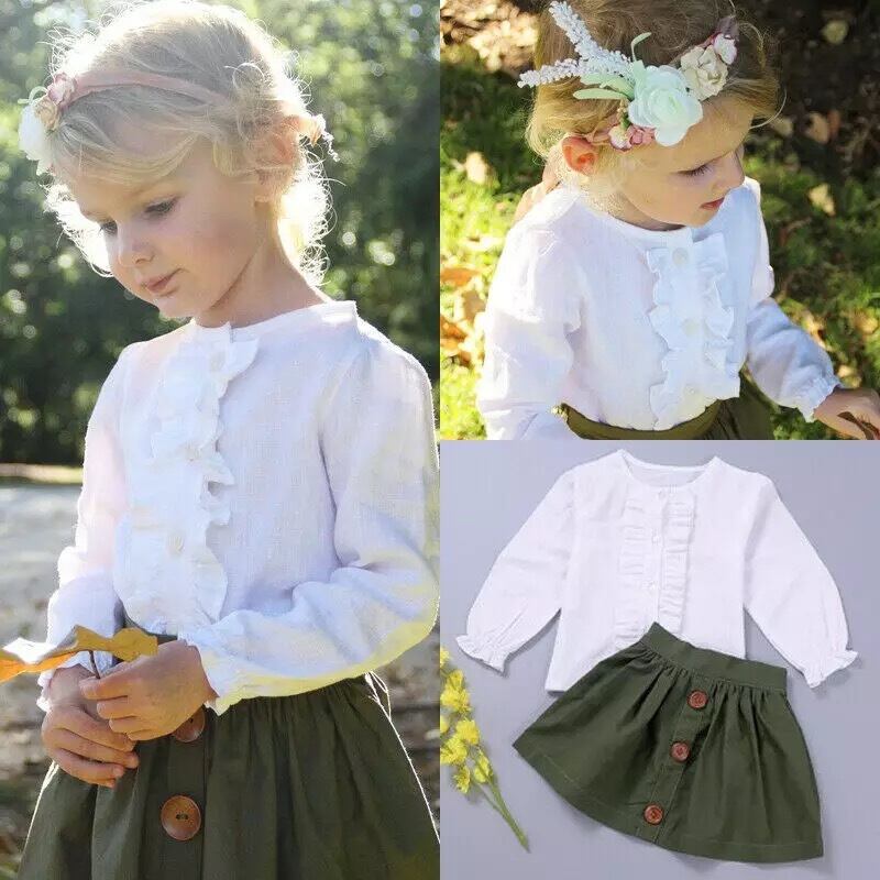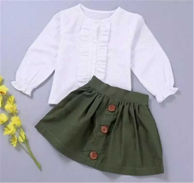 ★送料無料★ 女の子 フリルブラウス スカート セット 子供 ベビー キッズ ホワイト モスグリーン 春 夏