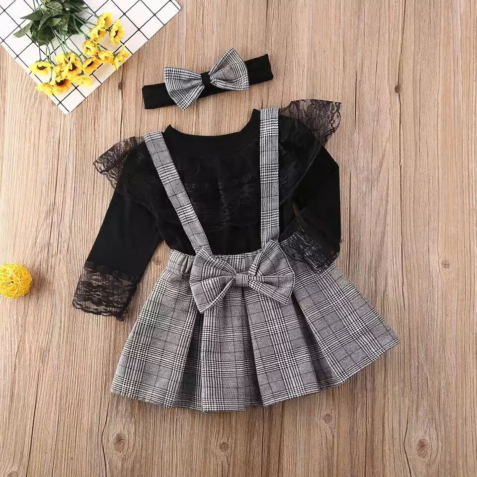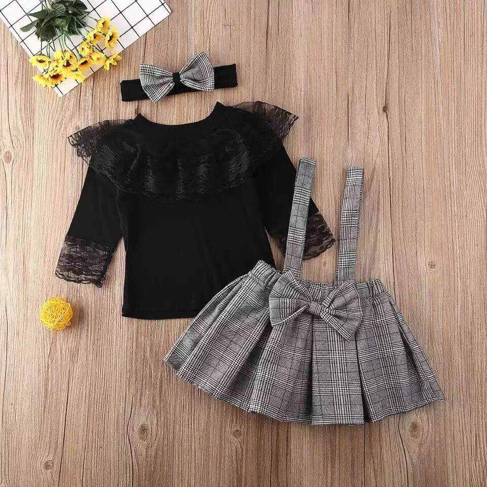★送料無料★ 女の子 チェック柄 リボン スカート レースブラウス ヘアバンド セット キッズ 子供 ジュニア 春 夏 モノトーン