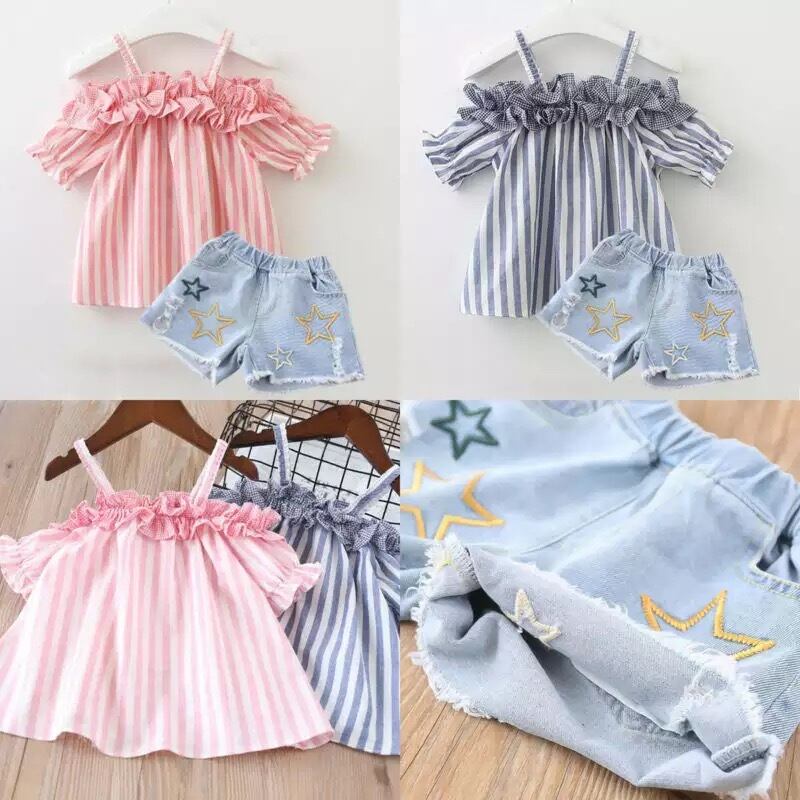 かわいい女の子のストライプブラウスとデニムショートパンツのセット?