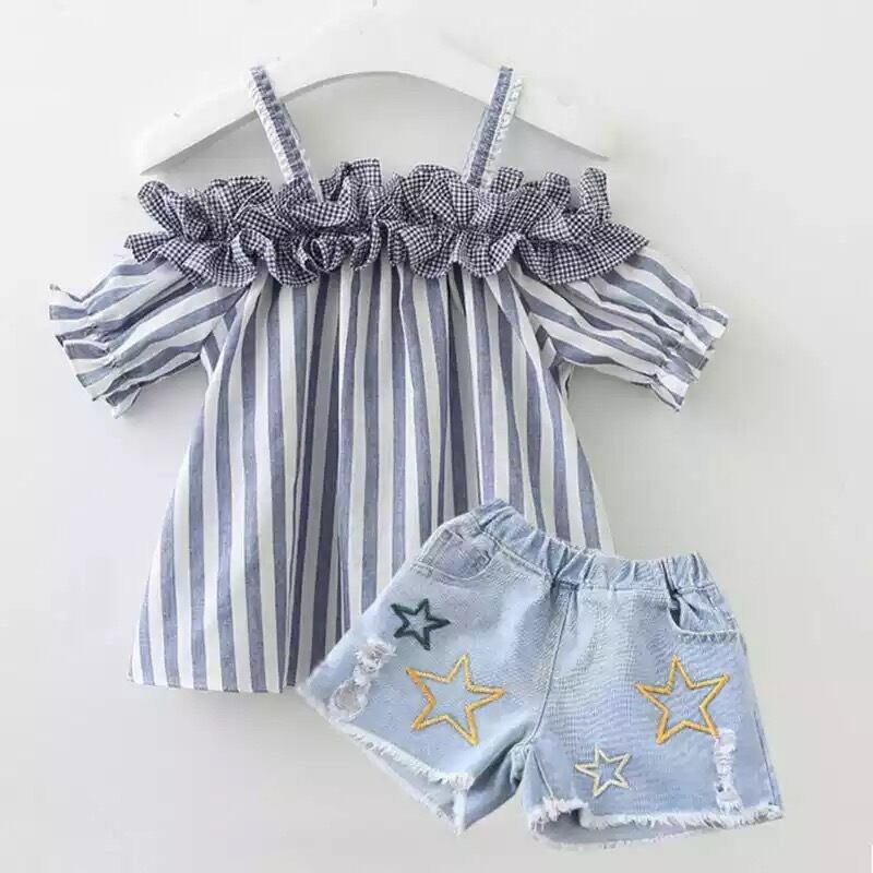 かわいい女の子のストライプブラウスとデニムショートパンツのセット?