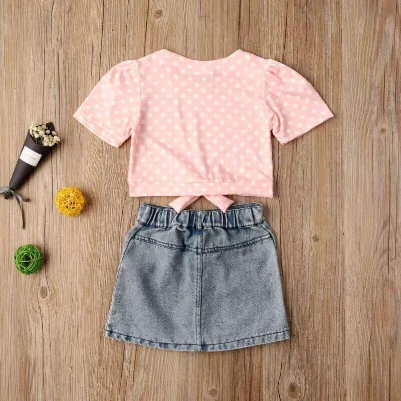 商品:キッズ ダメージデニムスカート、水玉ブラウスセット
