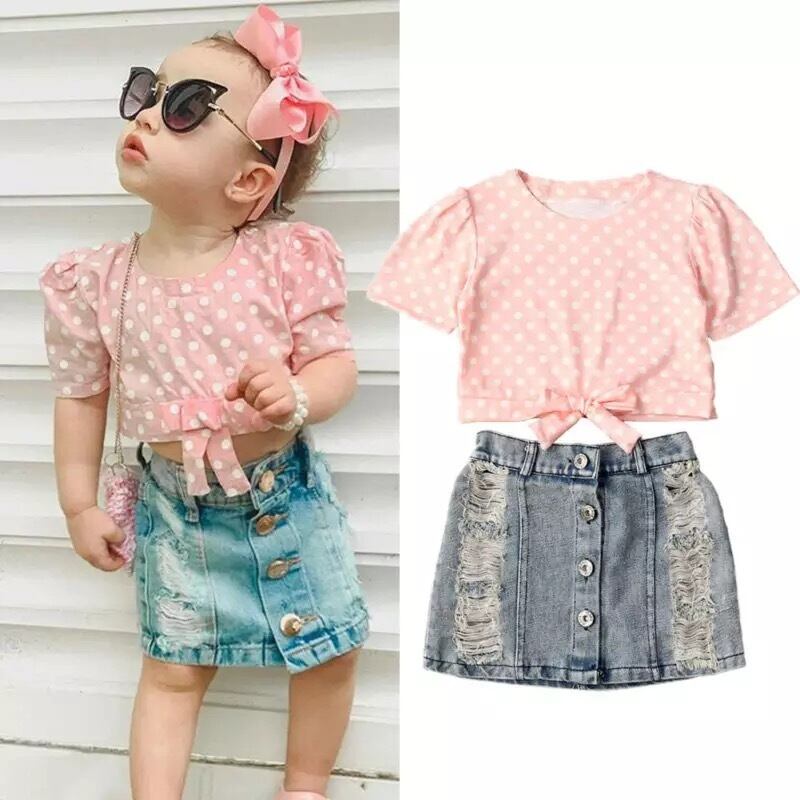 ★送料無料★ 女の子 ダメージ デニムスカート ドット ブラウス セット 水玉 子供 キッズ ベビー 春 夏