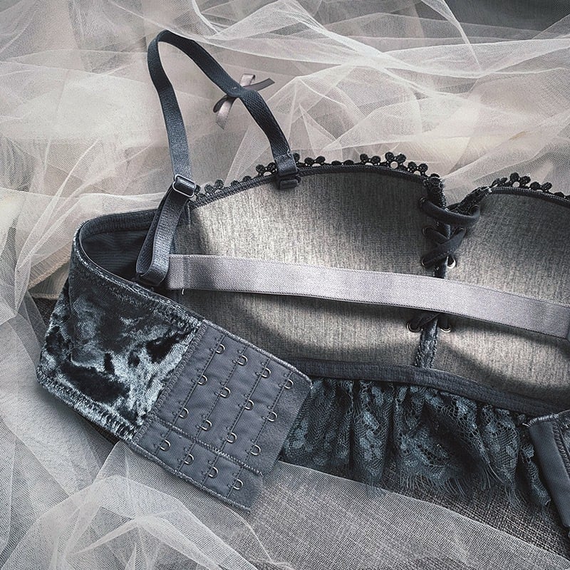 ★送料無料★ グレー 灰色 レディース 編み込み レースアップ ベロア ベルベット レース ランジェリー パンツ ブラジャー セット ショーツ 女性用
