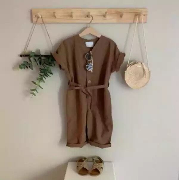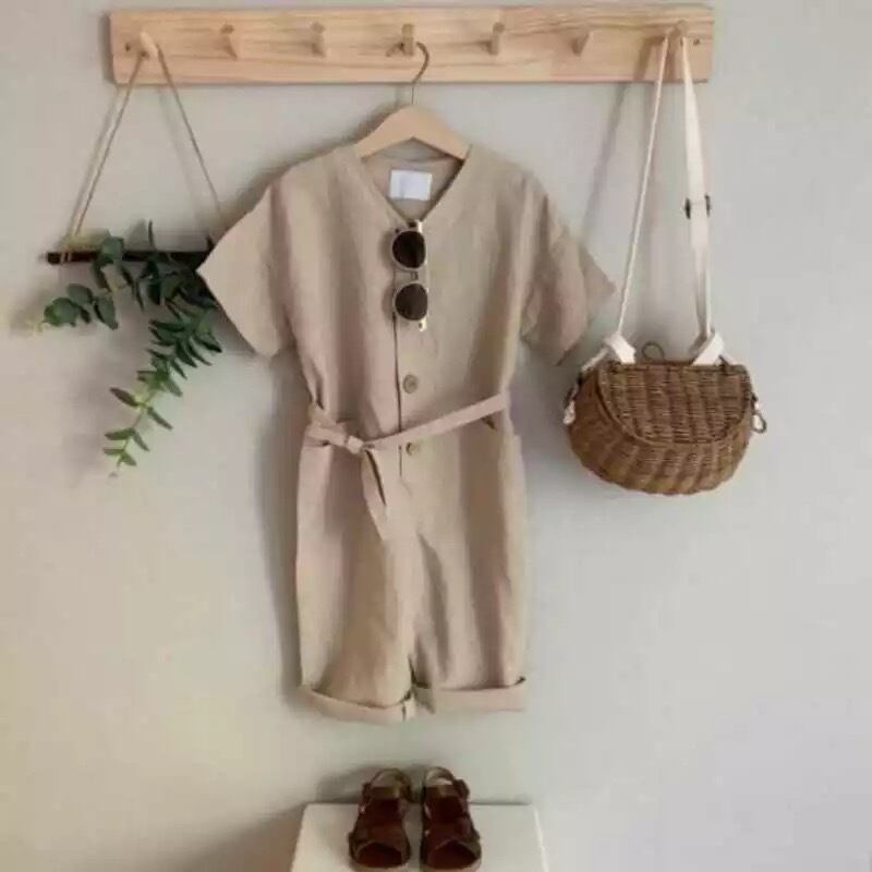 ★送料無料★ 2色 女の子 コットンリネン オールインワン サロペット ジャンプスーツ ウエストマーク リボン 優しい生地 子供 キッズ ベビー 春 夏