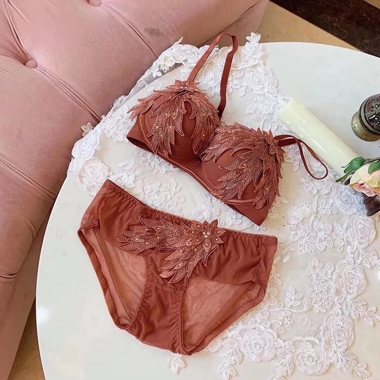 ★送料無料★ 4カラー オレンジ レディース フェザー 羽 刺繍 レース リボン ランジェリー パンツ ブラジャー セット ショーツ 女性用
