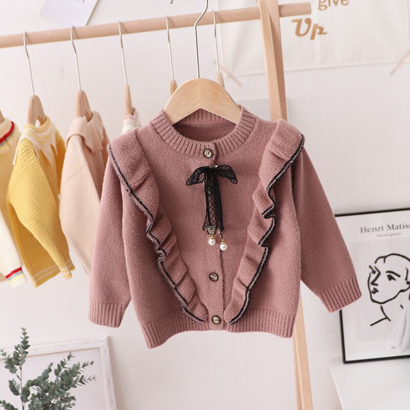 ★送料無料★ 3カラー 女の子 リボン フリル カーディガン ニット セーター 子供 キッズ ベビー 秋 冬