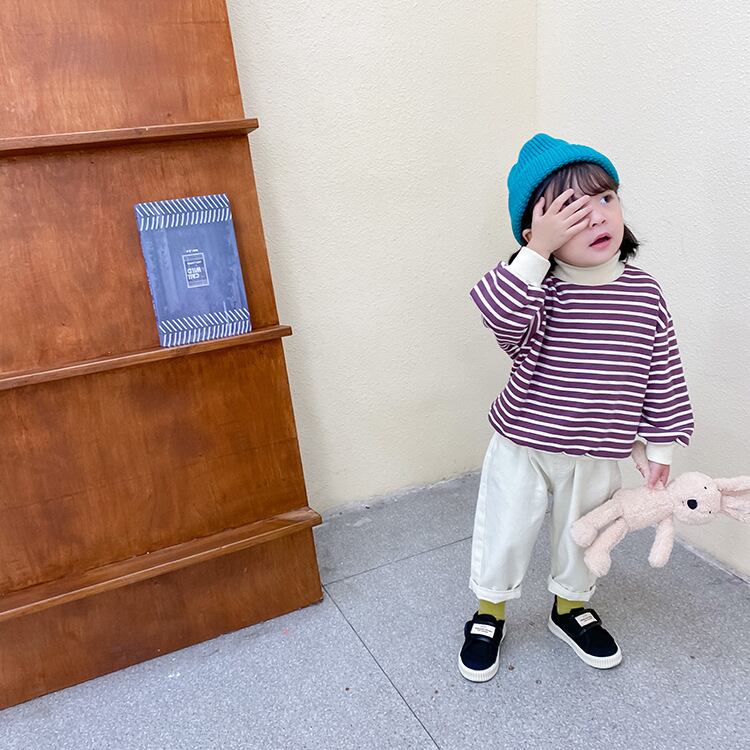 ★送料無料★ 3カラー ブラウン 茶色 女の子 長袖 ボーダー Tシャツ カットソー ロンT 子供 キッズ ベビー ジュニア 秋 冬 韓国