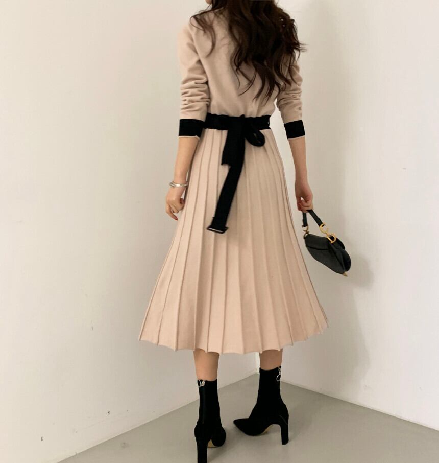 ★送料無料★ 2カラー ベージュ ブラック レディース ワンピース ニット 金ボタン プリーツスカート ウエストマーク 長袖 秋 冬