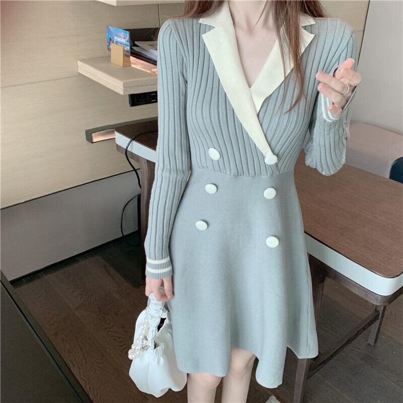 ★送料無料★ 3カラー レディース ワンピース ニット ダブル Vネック 長袖 秋 冬