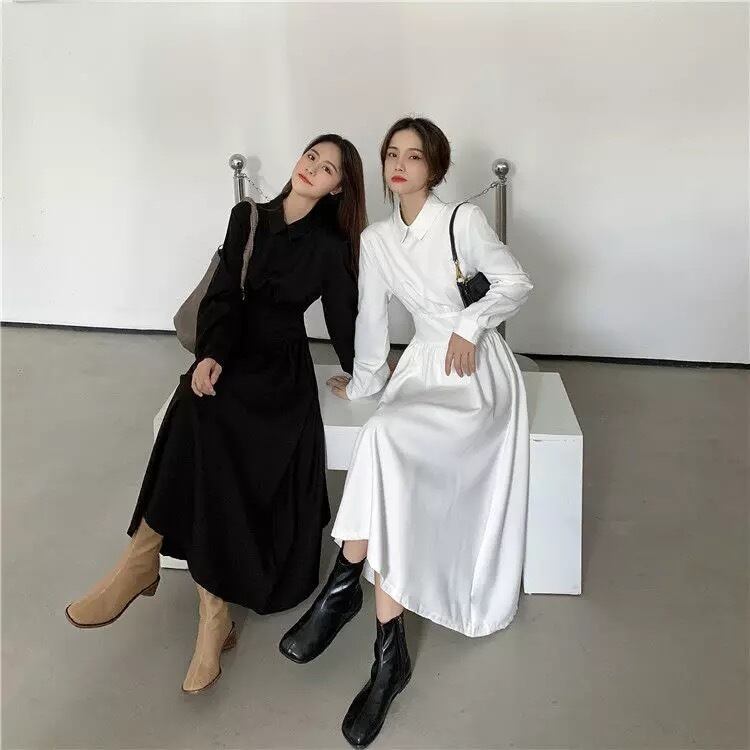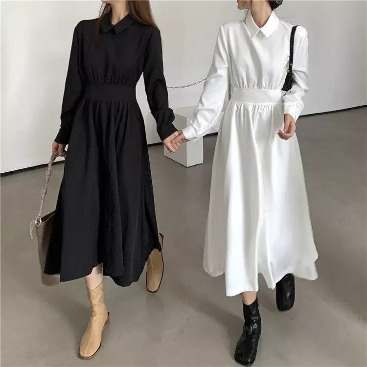 ★送料無料★ 2カラー ブラック 黒 レディース モノトーン ワンピース 襟付き オフィスカジュアル 春 夏 韓国