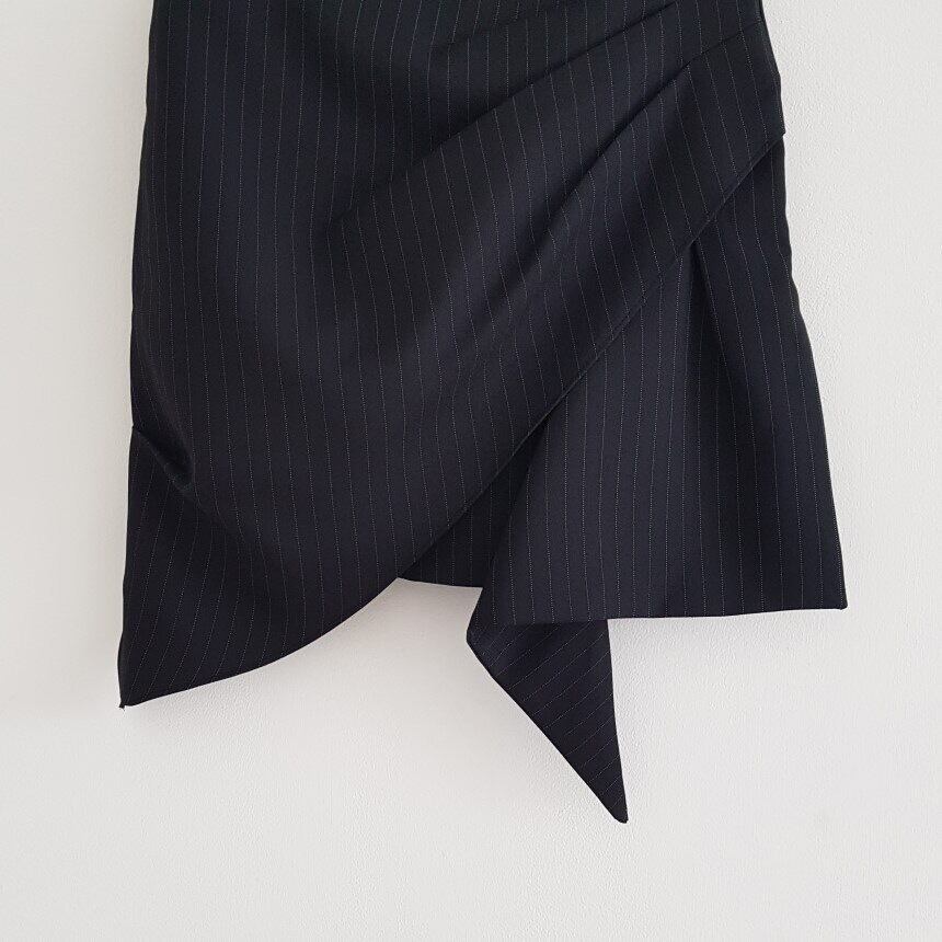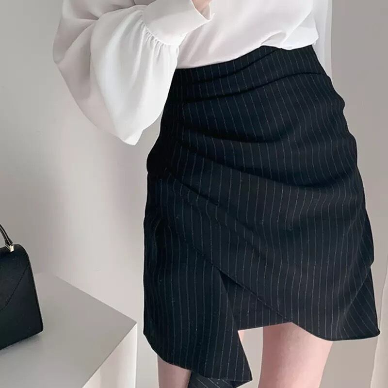 ★送料無料★ レディース 2色 ブラック 黒 リボン ストライプ スカート プリーツ ドレープ オフィスカジュアル ハイウエスト 春 夏 韓国