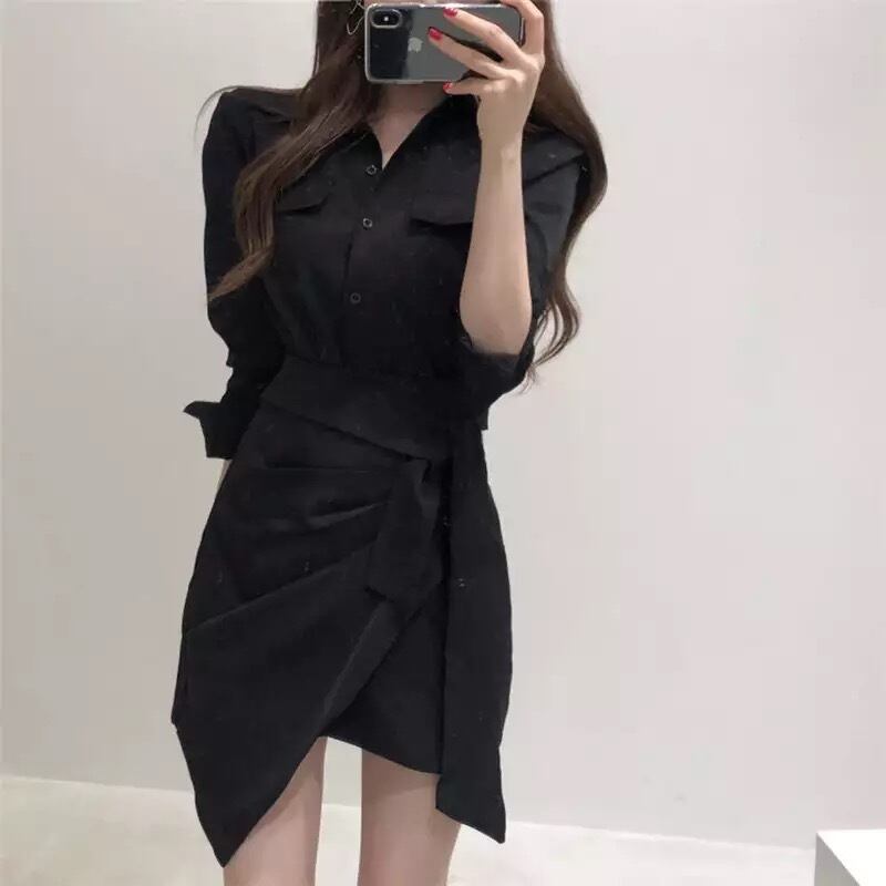★送料無料★ レディース 2色 シャツ スカート セットアップ プリーツ ドレープ アシンメトリー オフィスカジュアル ハイウエスト 春 夏 韓国