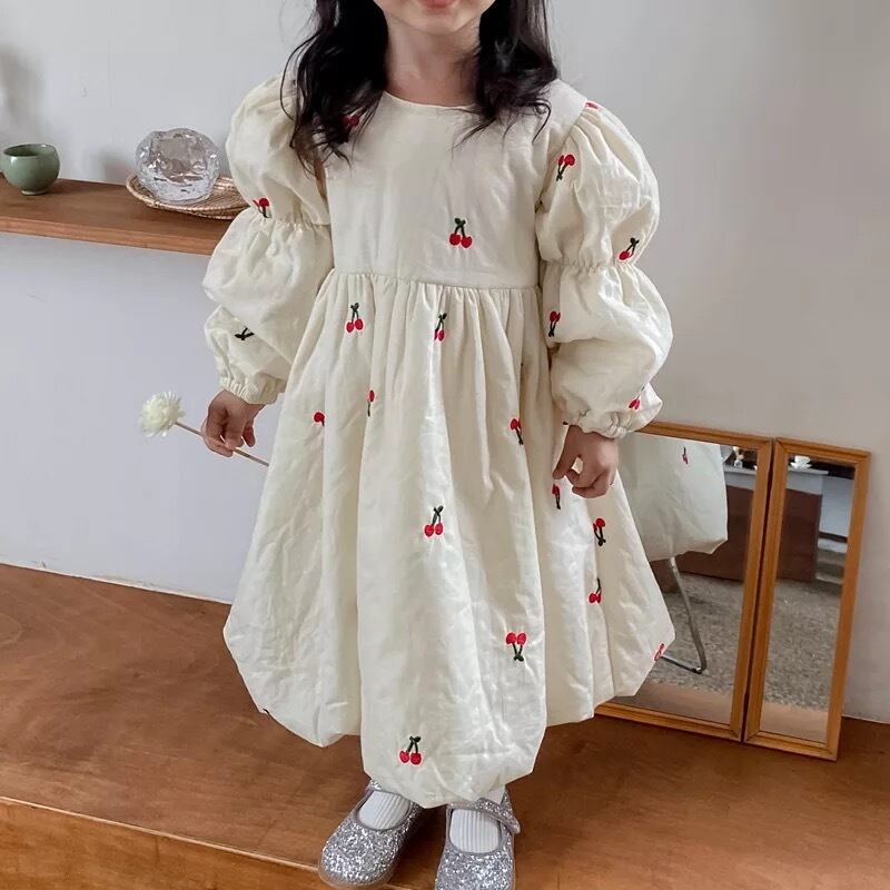 ★送料無料★ 女の子 パフスリーブ 長袖 さくらんぼ ワンピース ドレス サクランボ 子供 キッズ ベビー ジュニア ナチュラル 春 夏 韓国