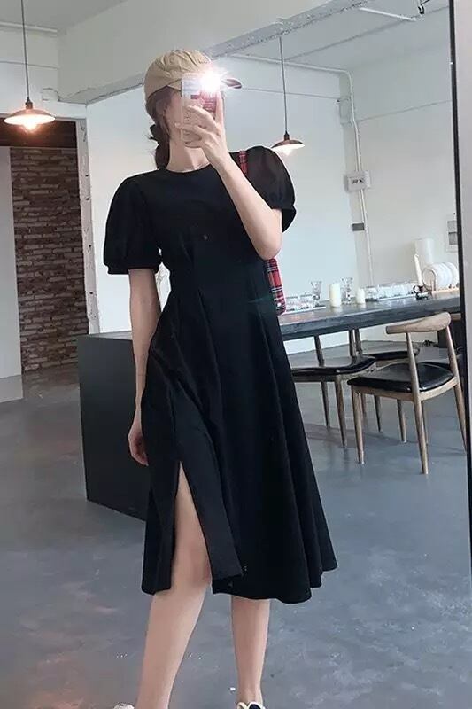 ★送料無料★ レディース 半袖 パフスリーブ ワンピース スリット フレア 春 夏 韓国
