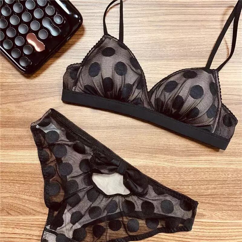 ★送料無料★ 4カラー レディース ドット 水玉 ランジェリー パンツ ブラジャー セット ショーツ 女性用 下着 シアー メッシュ 透け感