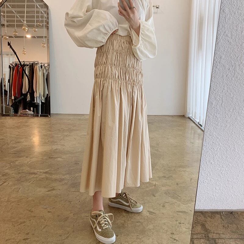 ★送料無料★ 2カラー ブラウン 茶 レディース ギャザー スカート ハイウエスト フレア オフィス アースカラー ロング ミモレ丈 春 夏 韓国