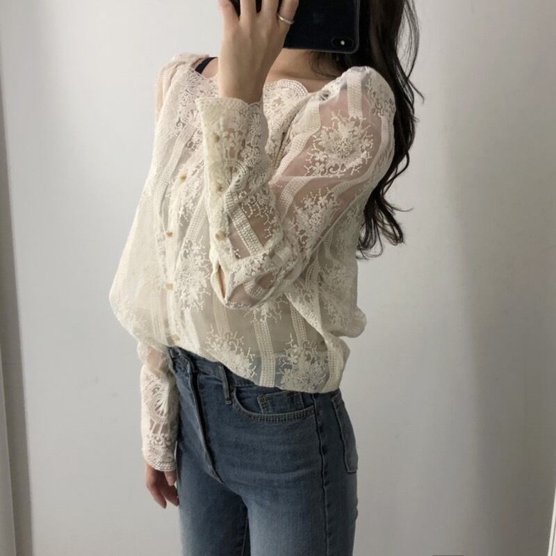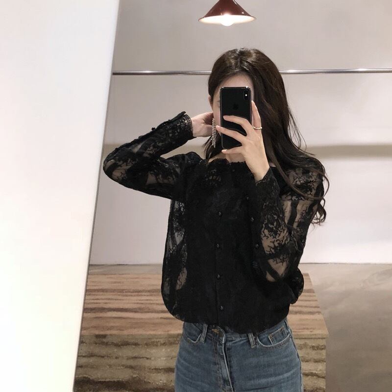 ★送料無料★ 3カラー ブラック 黒 レディース 長袖 シアーブラウス トップス オフィス カジュアル ナチュラル 花柄 透け感 シアー ブラウス春 夏 韓国 レース シャツ