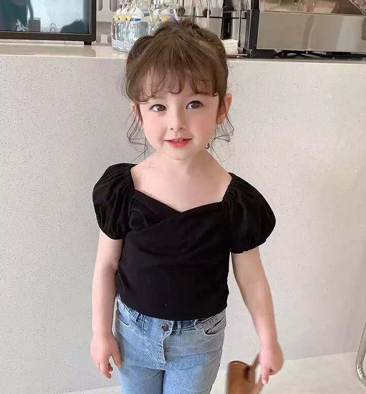 ★送料無料★ 3カラー 女の子 半袖 クロス パフスリーブ ブラウス ナチュラル キッズ ベビー 韓国 子供 春 夏