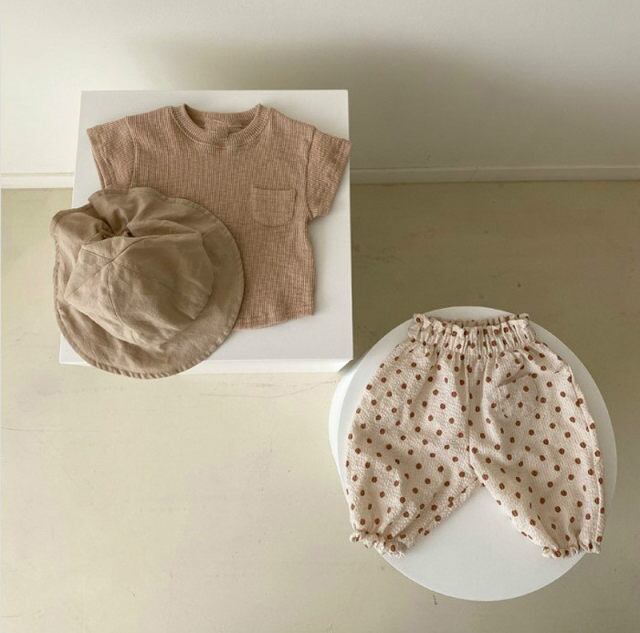 ★送料無料★ 2カラー ブラウン 茶 女の子 半袖 ナチュラル リブ ポケット Tシャツ カットソー キッズ ベビー 韓国 子供 春 夏