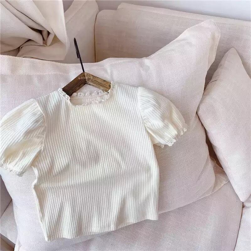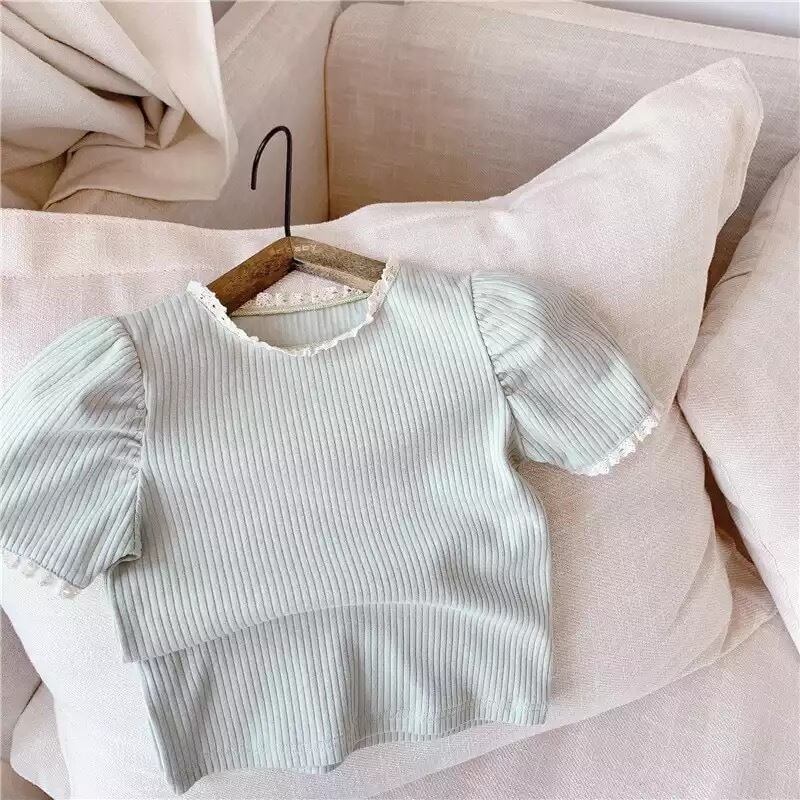 ★送料無料★ 2カラー グリーン 緑 女の子 半袖 ナチュラル レース Tシャツ カットソー キッズ ベビー 韓国 子供 春 夏 パフスリーブ レース袖 レースネック リブ パステル