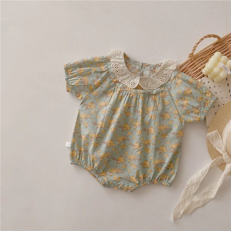 ★送料無料★ 2カラー ベージュ 女の子 花柄 フラワー フローラル 襟レース 襟付き 半袖 ロンパース 赤ちゃん ベビー キッズ 子供 春 夏 韓国 ナチュラル