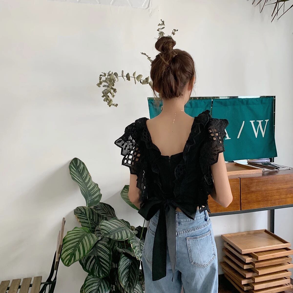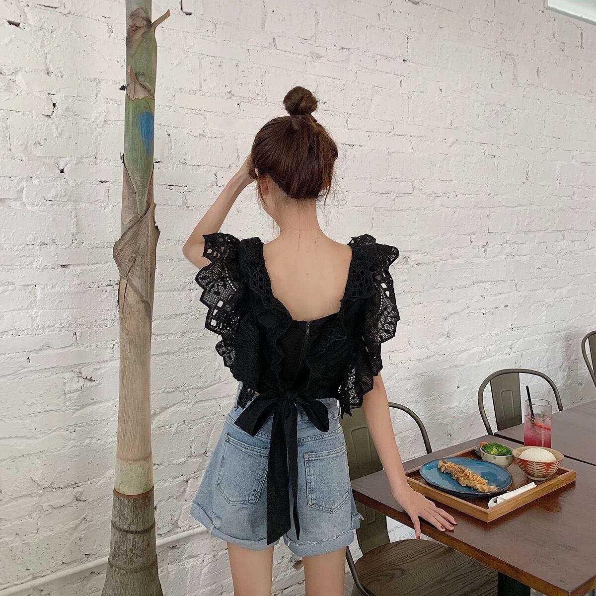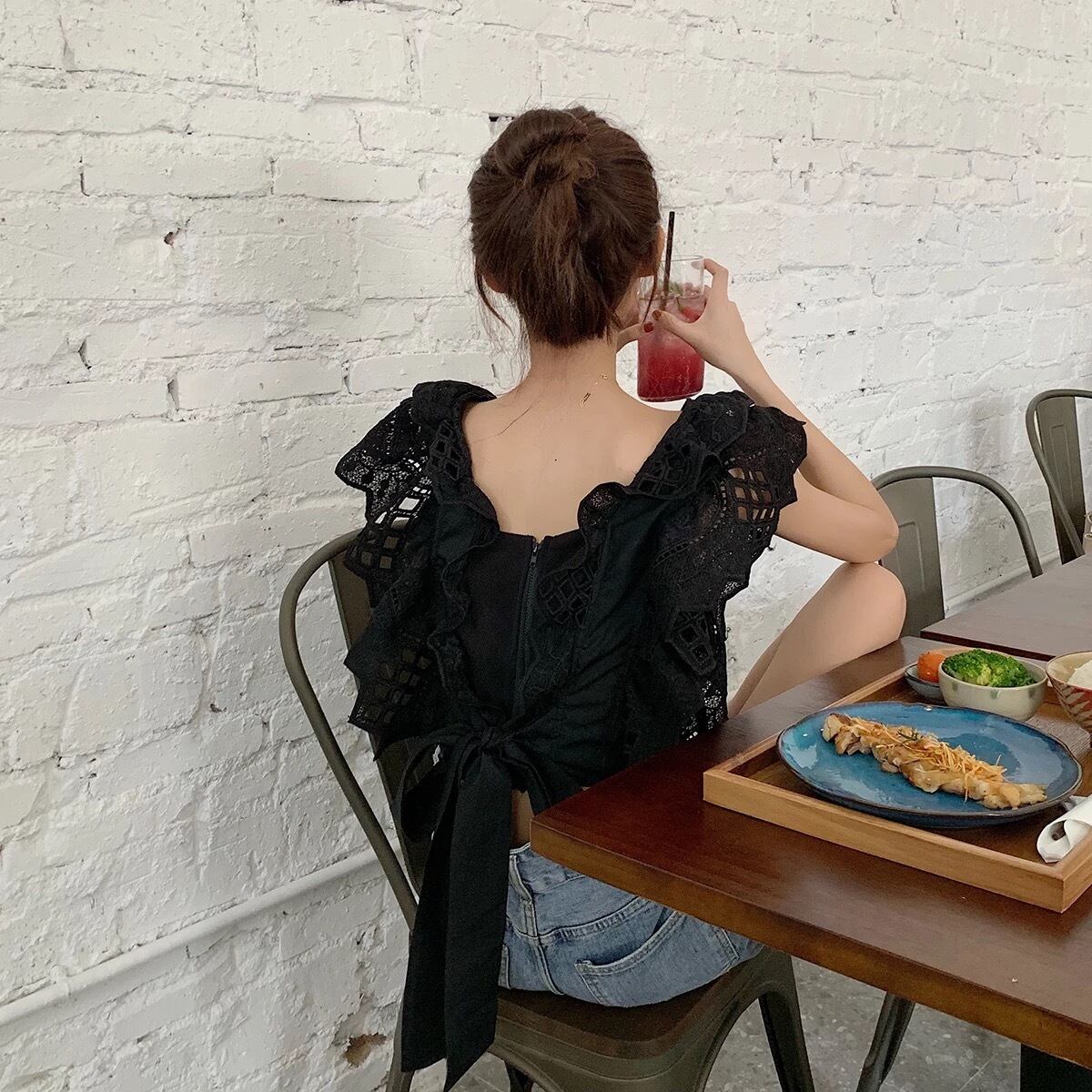 ★送料無料★ 2カラー レディース 半袖 バッグリボン レース ブラウス ナチュラル 春 夏 韓国 シャツ トップス バックリボン バッグオープン バックオープン 背中開き キャミソール 白 黒 モノトーン
