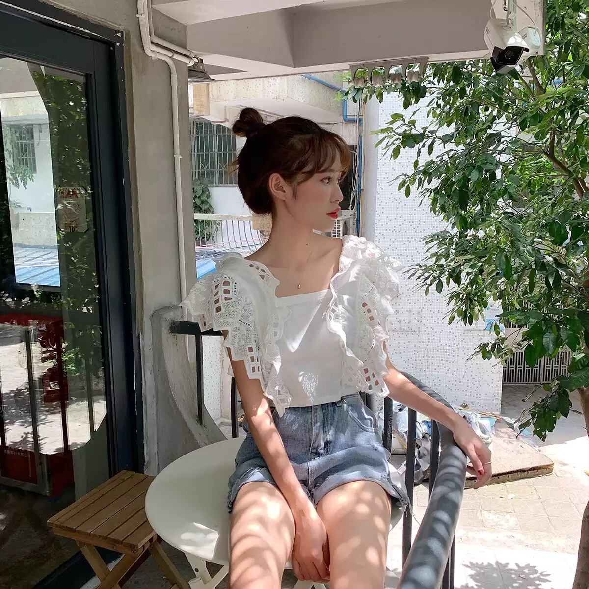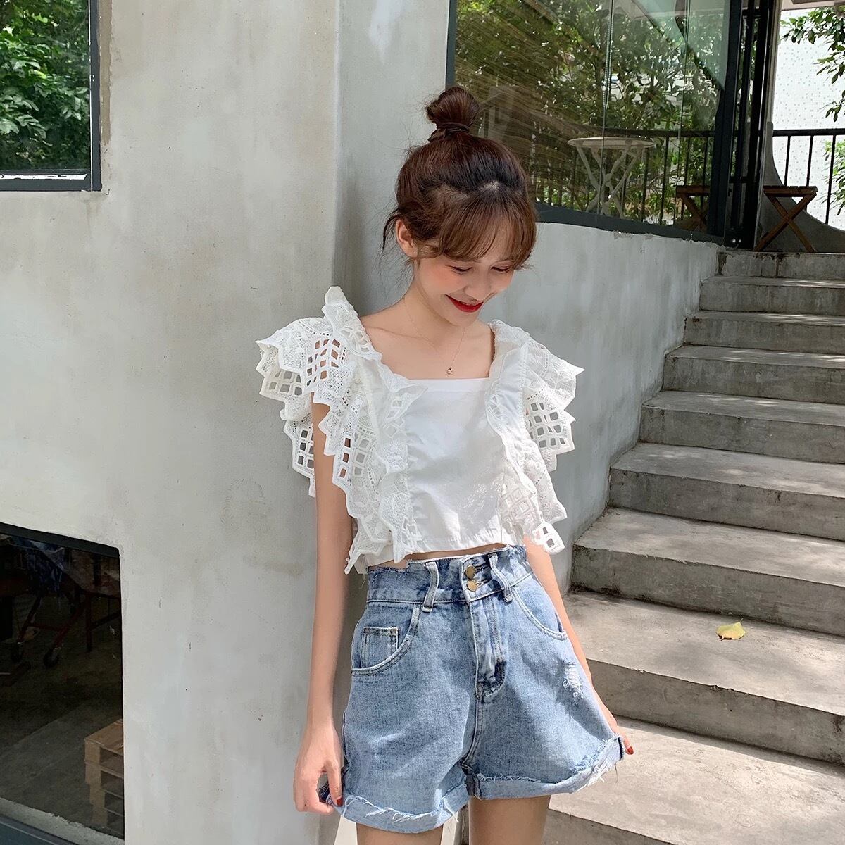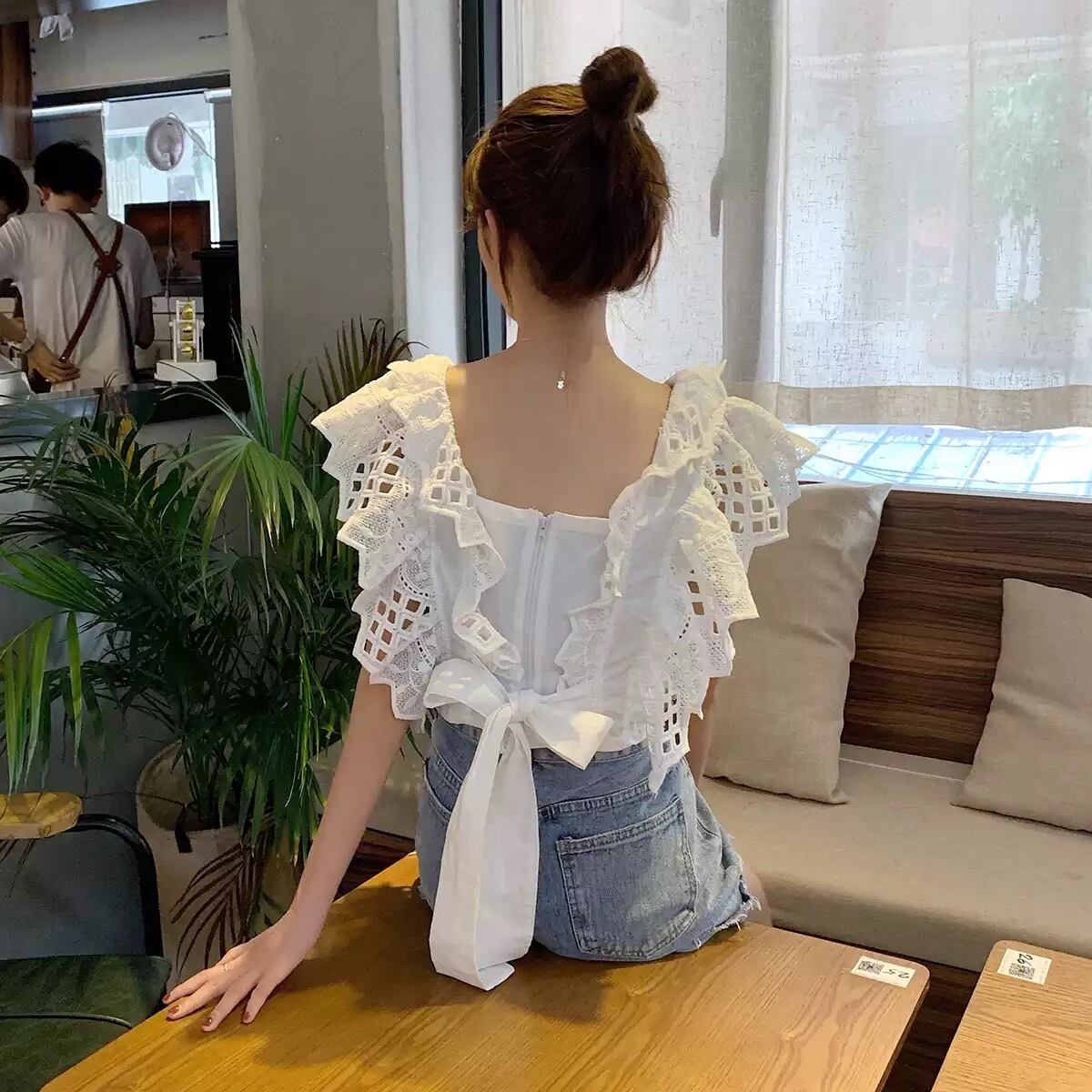 ★送料無料★ 2カラー レディース 半袖 バッグリボン レース ブラウス ナチュラル 春 夏 韓国 シャツ トップス バックリボン バッグオープン バックオープン 背中開き キャミソール 白 黒 モノトーン